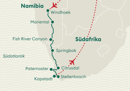 Reisen Sie nach Namibia, dann tauchen Sie ein in ein Land voller Abwechslung und Attraktionen. Sie erleben dort nicht nur eine einzigartige, fremde Kultur, sondern auch eine facettenreiche, wunderbare Natur mit vielen Abenteuern. Ausserdem sind Sie auf Safari-Reisen exotischen Tieren hautnah auf der Spur. Die Tierwelt Namibias ist beeindruckend, von den legendären Wildpferden der Wüste Namib bis hin zu den seltenen Wüstenelefanten, die durch die Ebenen des Nordens ziehen. Namibia ist im Wesentlichen ein Wüstenstaat, dessen Name soviel wie “Land der großen Weite” bedeutet. Im Süden des Landes herrscht eine epische Leere und Stille, wie man sie nirgends sonst auf der Welt antrifft. Von den riesigen roten Sanddünen und den versteinerten Bäumen von Sossusvlei bis hin zum gigantischen Fish River Canyon und der Trostlosigkeit der Wüste Namib besitzt Namibia die Eigenschaft, alles winzig erscheinen zu lassen. Die Infrastruktur des Landes ist vorbildlich und die freundlichen Einwohner machen Namibia Rundreisen zu einmaligen Erlebnissen.